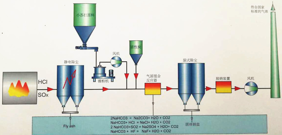此工藝直接將碳酸氫鈉細(xì)分直接噴入高溫?zé)煔?,在高溫下碳酸氫鈉分解成碳酸鈉Na2CO3,水(H2O)和二氧化碳(CO2),新產(chǎn)生的碳酸鈉在生成瞬間有高度的反應(yīng)活性,可自發(fā)的與煙氣中的酸性物質(zhì)進(jìn)行反應(yīng)